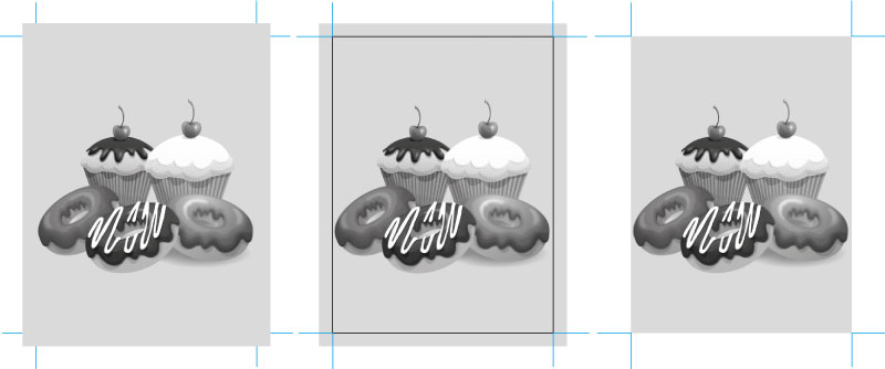 En el ejemplo puedes ver en primer lugar el documento correctamente preparado para la impresión con su sangrado. En la segunda imagen se sobrepone el área que cortará la guillotinan el tercero el resultado final.