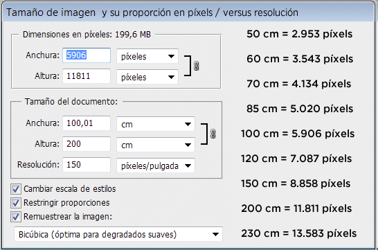 En el cuadro siguiente verá un escalado orientativo de tamaños y resoluciones para tener una idea de tamaños finales al 100% de imagen requeridos para su correcta impresión.